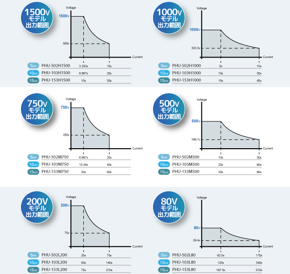 PHUシリーズは出力電圧80V~1500Vをラインナップし、5kW/10kW/15kWの電力範囲で出力比最大3倍のワイドレンジに対応した大容量直流安定化電源です。幅広い電圧と電流の組み合わせにより太陽光発電システム、電気自動車を含む自動車エレクトロニクスなど様々なアプリケーションに対応します。