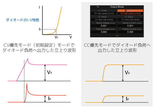 出力モードとしてCV優先(初期設定)とCC優先モード、立上り時間を設定可能なCVスルーレート制御とCCスルーレート制御の選択が可能。負荷にあわせた出力モードにより、オーバーシュートなどの発生を抑え、負荷に過度のストレスをかけない試験が可能です。