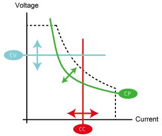 PHUシリーズは直流安定化電源として基本的なCVモード(定電圧制御)、CCモード(定電流制御)に加えて、負荷抵抗値が変化しても一定の電力を供給するCPモード(定電力制御)も搭載し、ヒーターなどの加熱デバイスの発熱量制御などにも利用いただけます。
