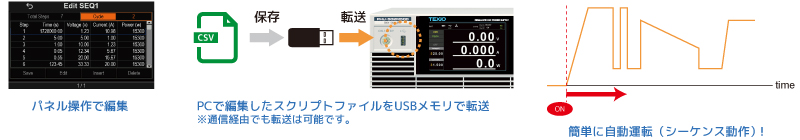 PHUシリーズは、各種設定値(電圧、電流、電力、保護設定値等)を任意の時間で自動運転が可能なシーケンス機能を搭載しています。パネル操作での作成の他、テストデータ(スクリプト)をCSV形式で作成し、作成したCSVファイルをUSBメモリから転送・保存し、電源単体でスクリプトを実効することも可能です。