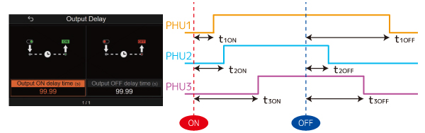 OUTPUT ON/OFFの指令に対して、任意の遅延時間を設定することができます。複数台を連携するシステムにおいて、常に一定の時間差を設けることができます。