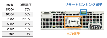 出力端子から負荷までの配線抵抗による電圧降下分を補償することができます。(補償電圧は定格×5%)