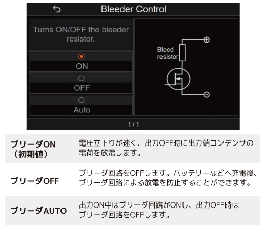 OUTPUT OFF時に出力電圧を速く低下させるためのブリーダ回路が搭載され、設定でON/OFF/AUTOの選択が可能。OFFやAUTOにすることで、OUTPUT OFF時にバッテリー等の放電を少なくすることができます。