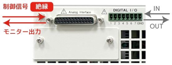 PHUシリーズはアナログ制御が絶縁されているため、安全な制御・モニターが可能です。(DIGITAL I/OのGNDはシャシー(筐体)のため、非絶縁)