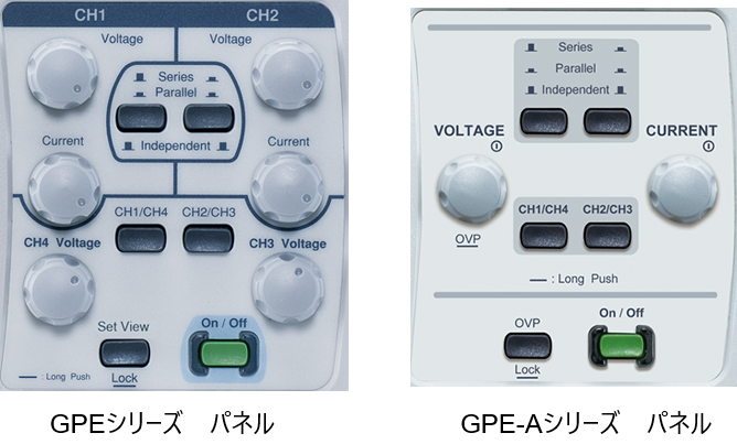 電圧・電流値設定ツマミをチャンネルごとのボリュームからエンコーダに変更することで操作の簡略化、設定値固定の強化をおこないました。また過電圧保護機能は定格電圧値固定から任意の電圧値で動作するように変更しています。そのほかの電気的仕様は変更ありません。