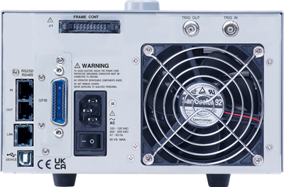 リアパネルにリモートコントロール用コネクタを備え、外部からの接点信号によりロードオン/オフができます。また、外部電圧、外部抵抗により入力値を設定することもできます。通信による設定は標準でUSBおよびRS-232C、オプションでGP-IB,LANが利用可能ですので、PCやシーケンサ(PLC)から簡単に制御できます。